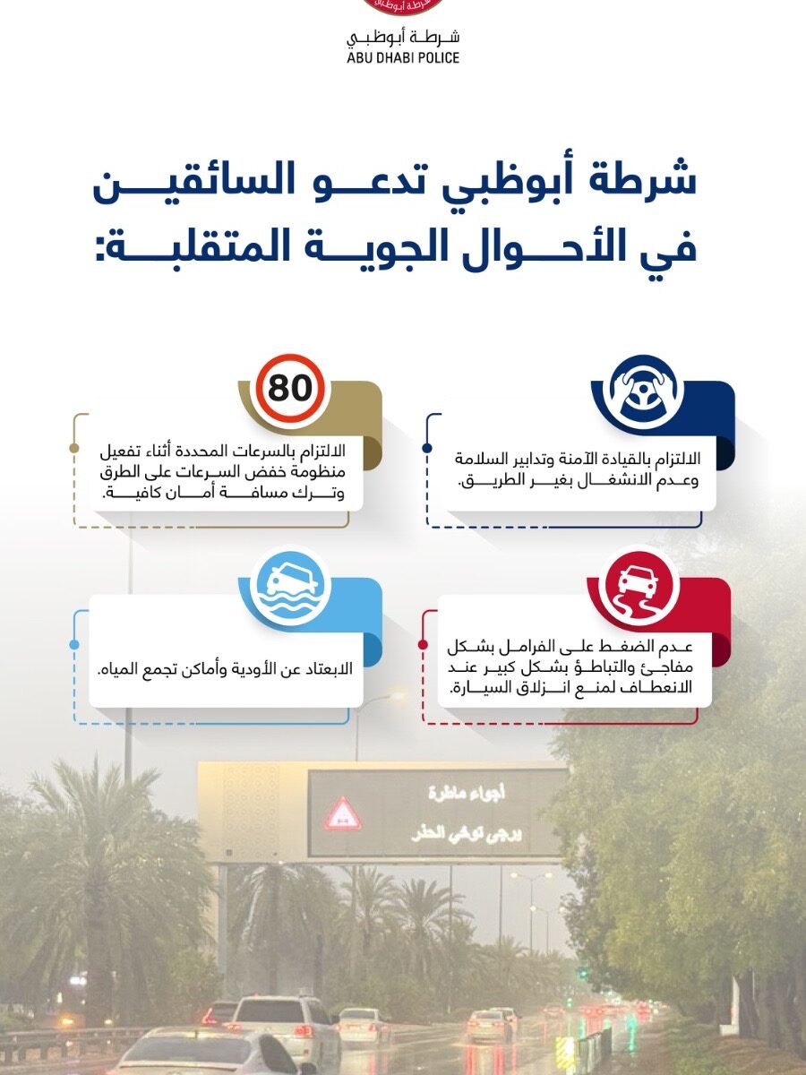 ABU DHABI, 11th April, 2026 (WAM) — The Abu Dhabi Police has urged motorists to adhere to safe driving practices and safety measures, and to avoid distractions while driving during rainfall and unstable weather conditions.