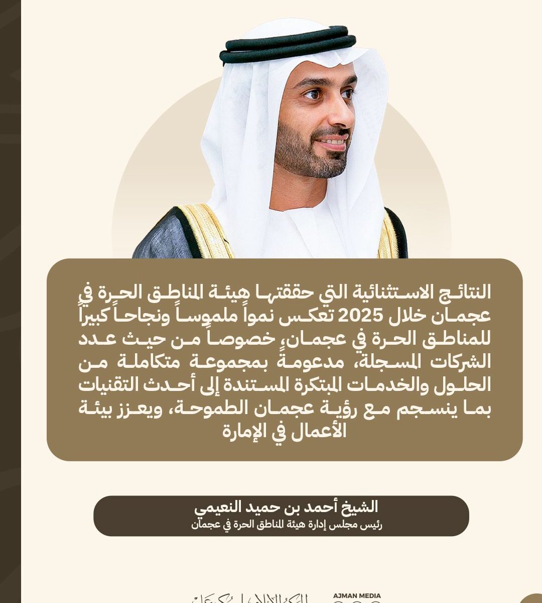 H.H. Sheikh Ahmed bin Humaid Al Nuaimi, Chairman of the Board of Ajman Free Zones Authority, said the results reflect tangible growth and the significant success of the free zones, supported by innovative solutions and services based on the latest advanced technologies, in line with Ajman’s ambitious vision and efforts to strengthen the emirate’s business environment.
