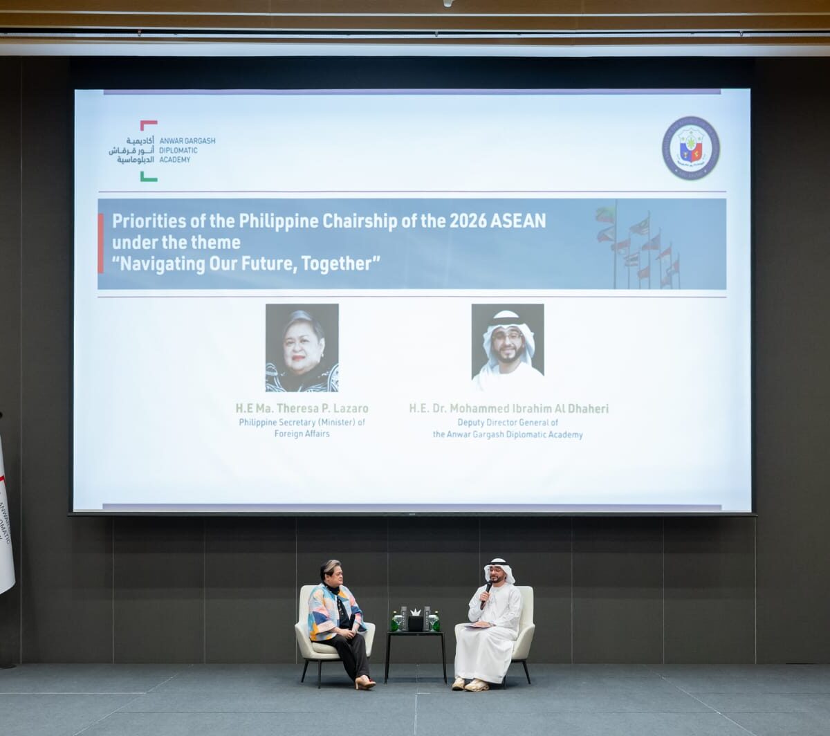 ABU DHABI, 13th January, 2026 (WAM) — The Anwar Gargash Diplomatic Academy (AGDA) hosted a dialogue session with Maria Theresa P. Lazaro, Secretary of Foreign Affairs of the Republic of the Philippines, to discuss the Philippines’ strategic priorities during its Chairship of the Association of Southeast Asian Nations (ASEAN) in 2026, under the theme “Navigating Our Future, Together.”
