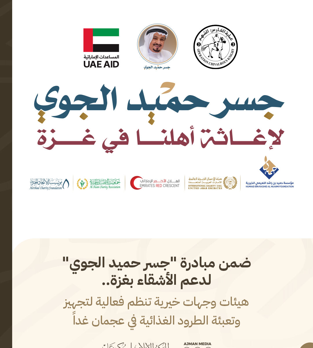 The launch of the air bridge comes with the participation of several charitable organisations in the Emirate of Ajman, namely the Humaid bin Rashid Al Nuaimi Charity Foundation, the International Charity Organisation, the Emirates Red Crescent, Al Ihsan Charity Association, and Al Etihad Charity Foundation. These entities will oversee the preparation of aid and coordinate shipping and delivery operations to ensure its swift arrival to beneficiaries.