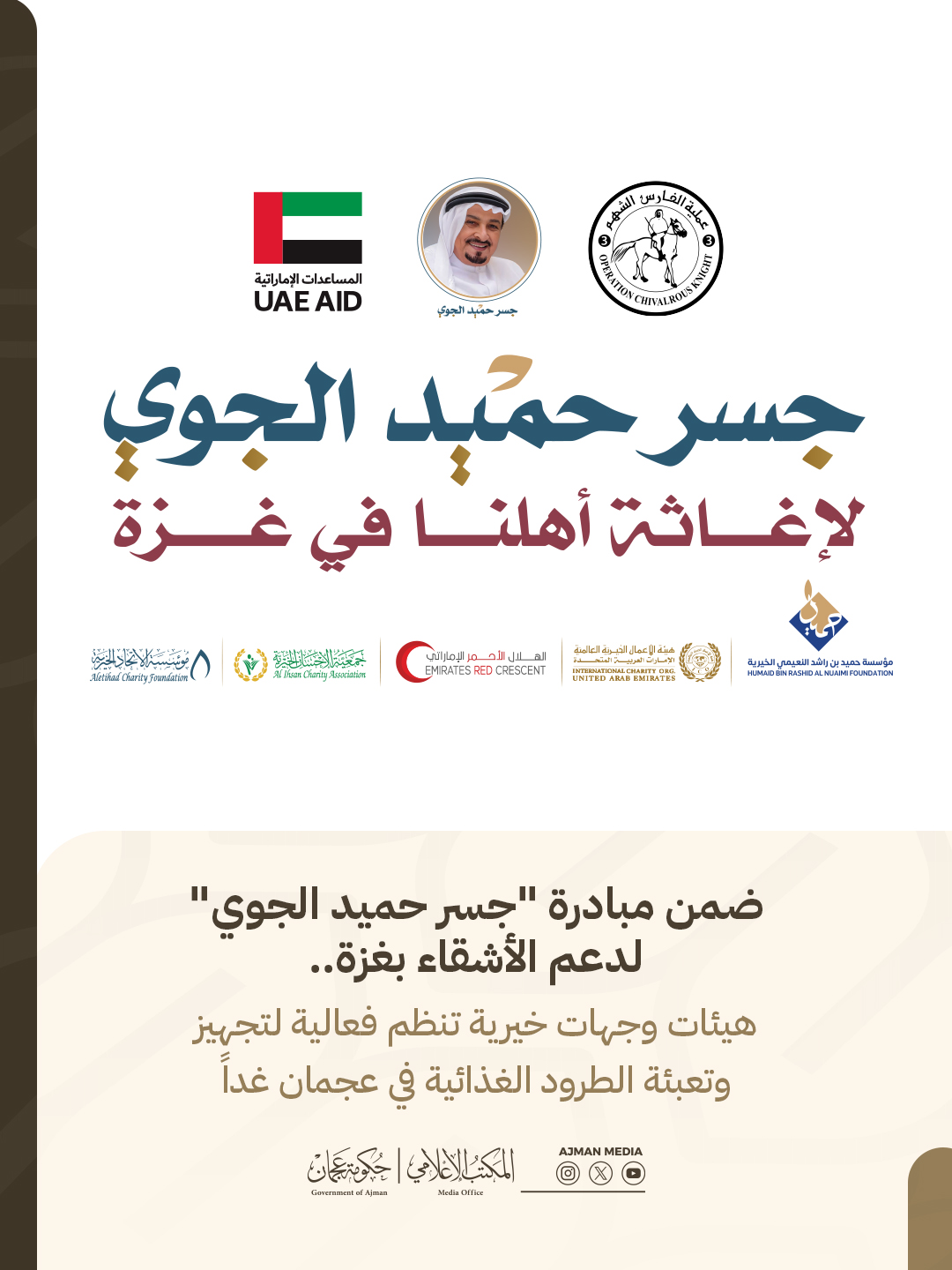 The launch of the air bridge comes with the participation of several charitable organisations in the Emirate of Ajman, namely the Humaid bin Rashid Al Nuaimi Charity Foundation, the International Charity Organisation, the Emirates Red Crescent, Al Ihsan Charity Association, and Al Etihad Charity Foundation. These entities will oversee the preparation of aid and coordinate shipping and delivery operations to ensure its swift arrival to beneficiaries.