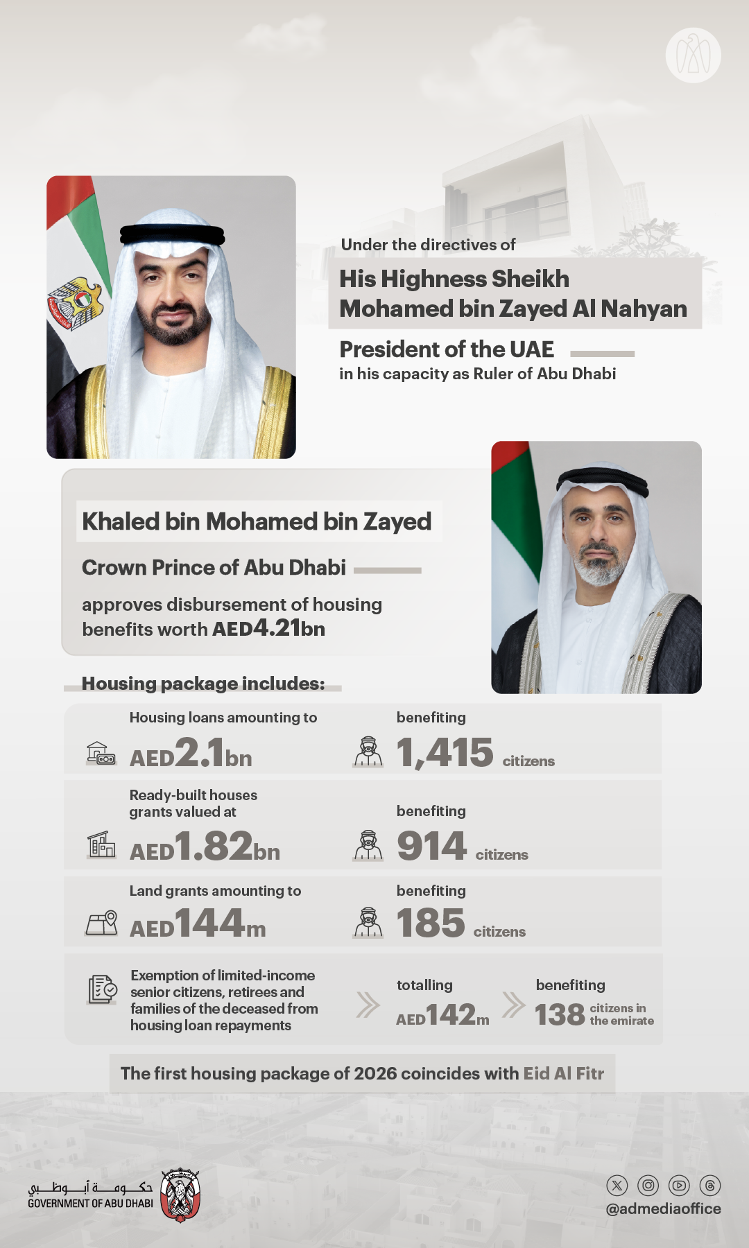 ABU DHABI, 18th March, 2026 (WAM) — Under the directives of President His Highness Sheikh Mohamed bin Zayed Al Nahyan, in his capacity as Ruler of Abu Dhabi, H.H. Sheikh Khaled bin Mohamed bin Zayed Al Nahyan, Crown Prince of Abu Dhabi and Chairman of the Abu Dhabi Executive Council, has approved a housing benefits package worth AED4.21 billion, benefiting 2,652 Emirati citizens across the emirate.
