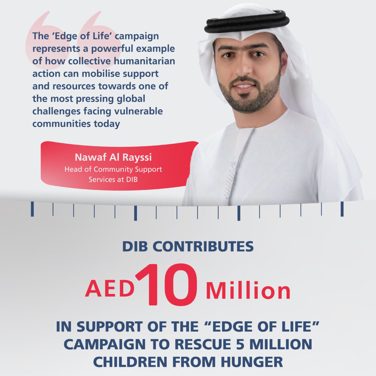 “The ‘Edge of Life’ campaign represents a powerful example of how collective humanitarian action can mobilise support and resources towards one of the most pressing global challenges facing vulnerable communities today,” said Nawaf Al Rayssi, Head of Community Support Services at DIB.