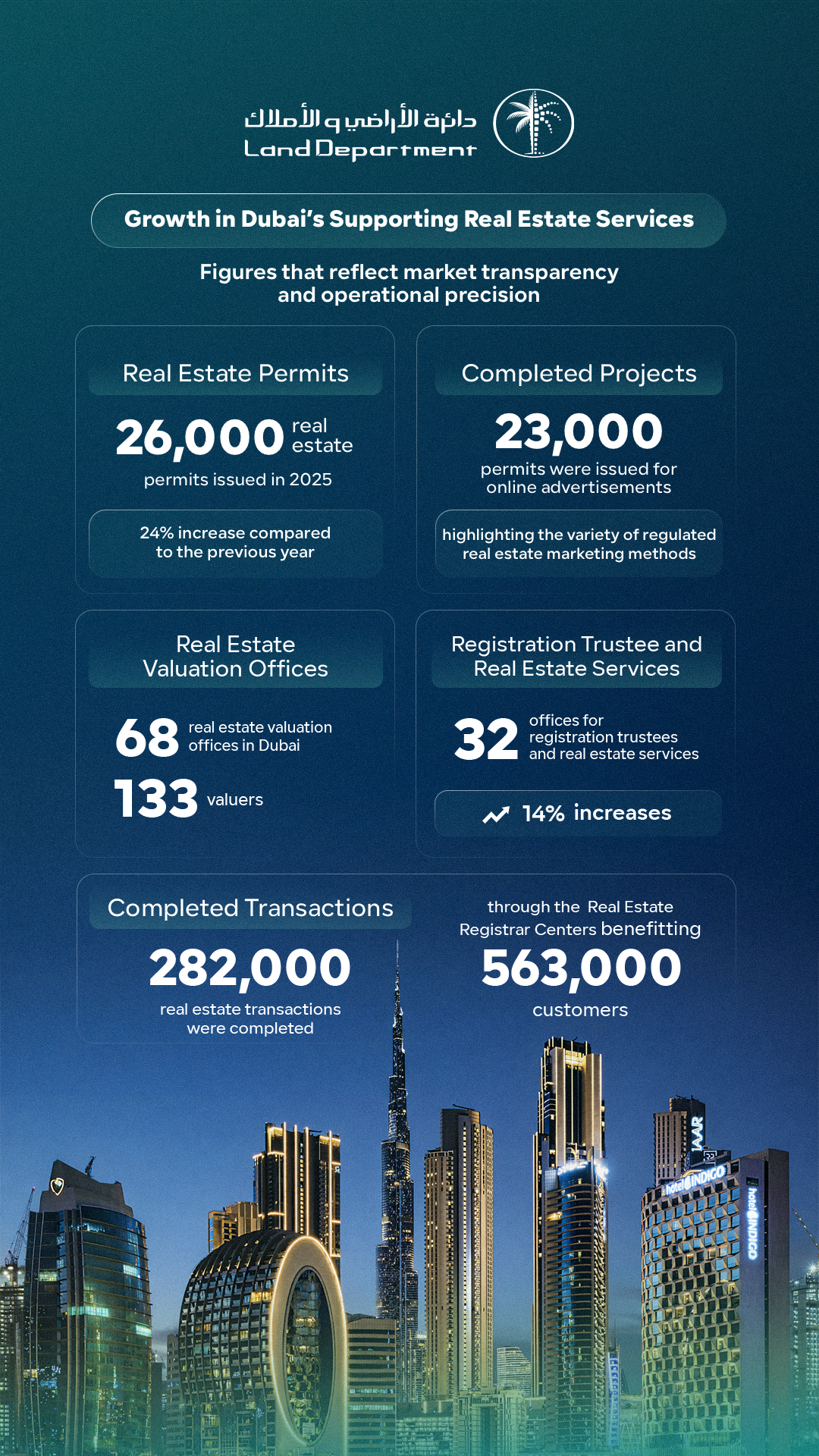 Overall, this integrated performance reflects the transformation of real estate support services into a core pillar that enhances market efficiency, strengthens regulatory discipline and reinforces investor and customer confidence. It also underscores the commitment of Dubai Land Department to continuously develop this ecosystem, enhance service quality and expand its scope in line with the sustainable growth of the real estate sector, laying the foundation for a more resilient, transparent and sustainable phase in the years ahead.