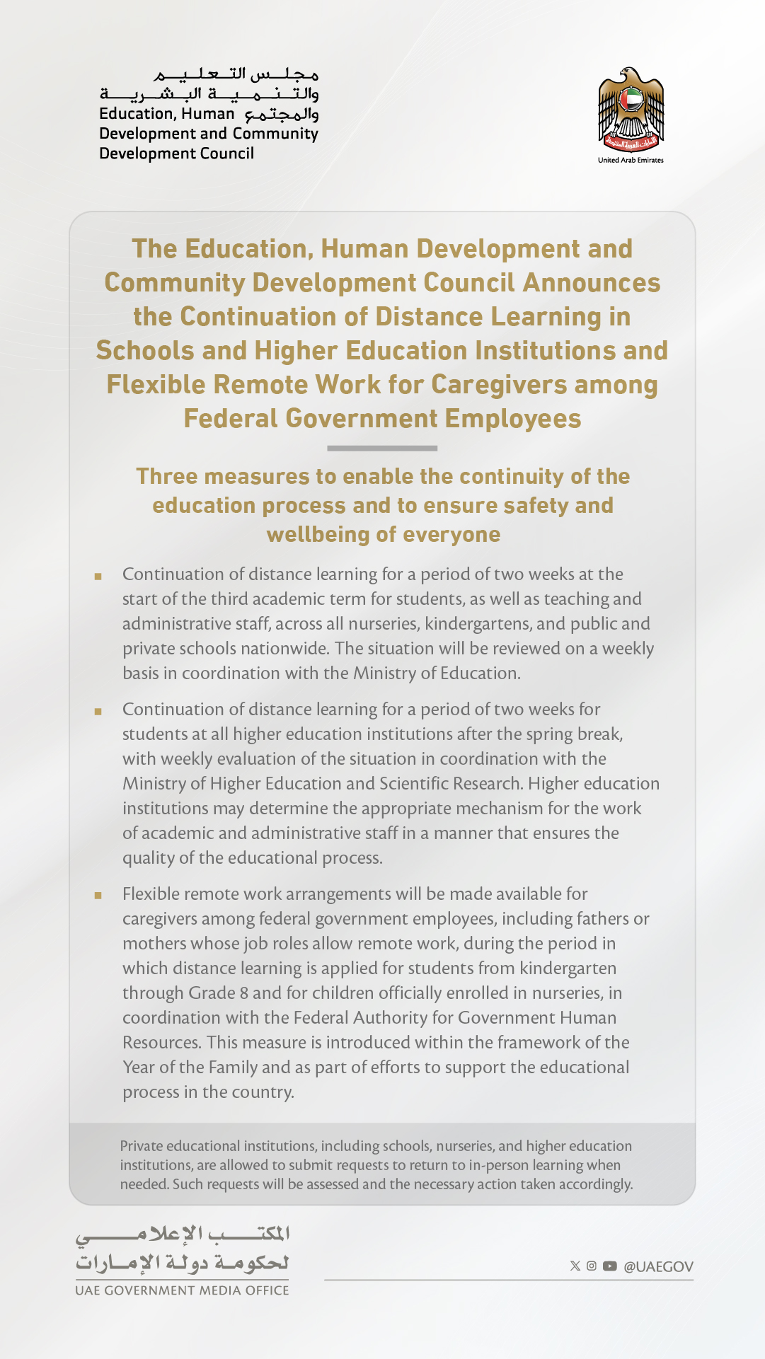 ABU DHABI, 17th March, 2026 (WAM) — The Education, Human Development, and Community Development Council has announced three regulatory measures aimed at ensuring the continuity of the educational process across the country while safeguarding the safety of students and the wider educational community, in coordination with the relevant entities within the national education system and the federal government work ecosystem.