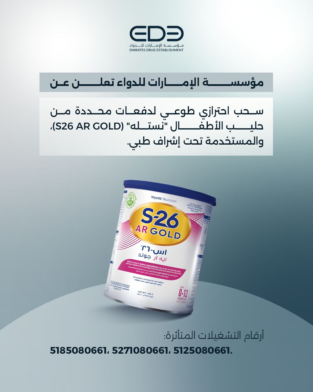 DUBAI, 15th January, 2026 (WAM) — The Emirates Drug Establishment (EDE) announced that an additional product, S26 AR, has been included in the scope of the voluntary and precautionary recall of Nestlé infant formula, which is intended for use exclusively under medical supervision.