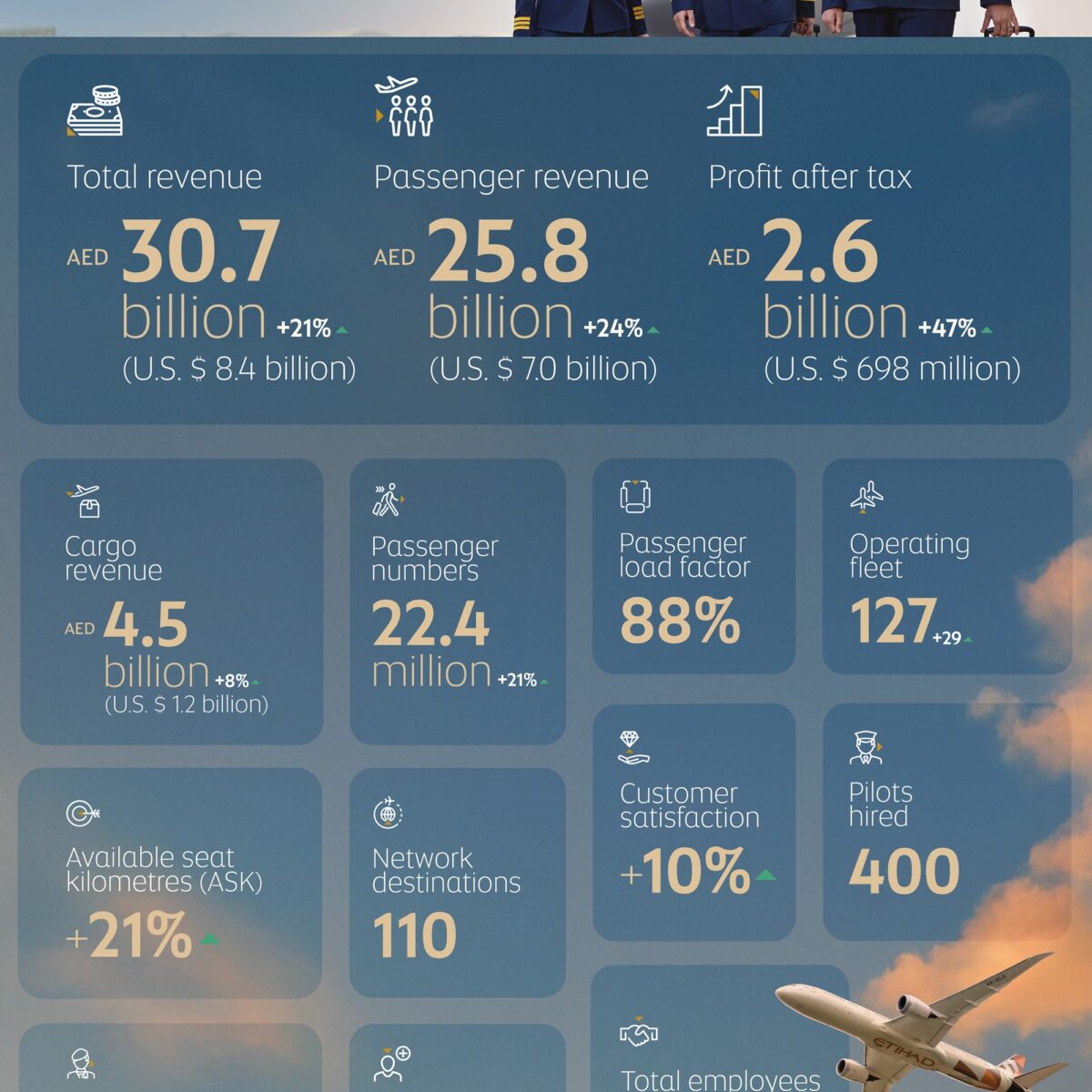 Etihad carried 22.4 million passengers, supported by a 21 percent capacity increase year-on-year, with available seat kilometres (ASK) reaching 111.5 billion.