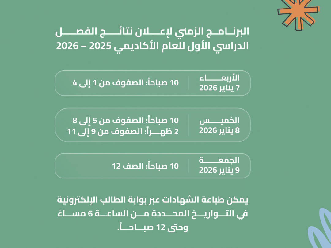 ABU DHABI, 5th January, 2026 (WAM) — The Ministry of Education (MoE) has announced the schedule for the release of term 1, results for the 2025-2026 academic year, covering all educational cycles.