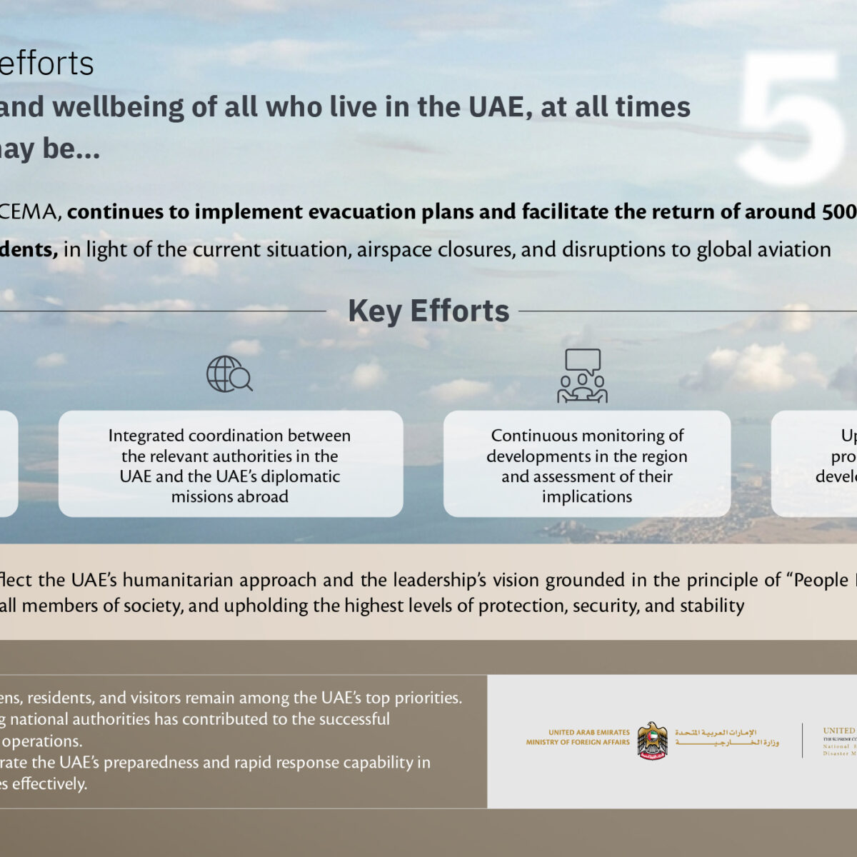 MoFA and NCEMA affirmed that from the very first moments of the developments witnessed in the region, both entities were fully prepared to respond by taking the necessary precautionary and proactive measures, each within its respective mandate. This included continuous coordination and communication with the relevant authorities in the UAE and the country’s diplomatic missions abroad, ongoing monitoring of developments and assessment of their implications, as well as the regular updating of approved plans in line with evolving circumstances.