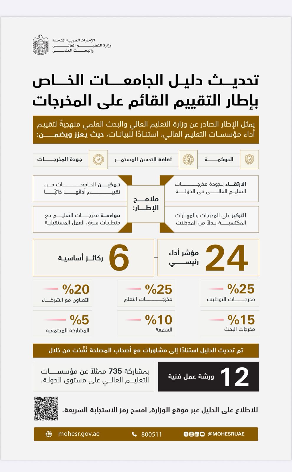 ABU DHABI, 26th March, 2026 (WAM) — The Ministry of Higher Education and Scientific Research (MoHESR) has published the updated Outcome-Based Evaluation Framework (OBEF) University Guidebook, aimed at supporting higher education institutions (HEIs) in succeeding within an outcome-driven environment.