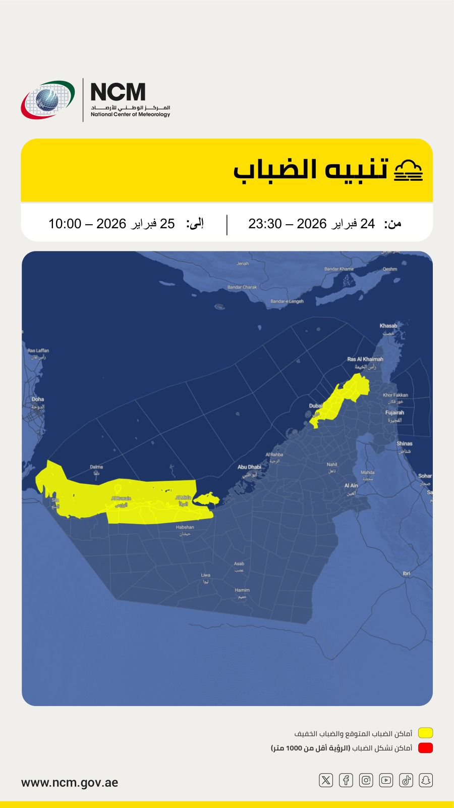 ABU DHABI, 25th February, 2026 (WAM) — Commuters and residents across the UAE have been urged to exercise extreme caution as the National Centre of Meteorology (NCM) issued a weather alert for dense fog and sharply deteriorating visibility starting late Tuesday night.