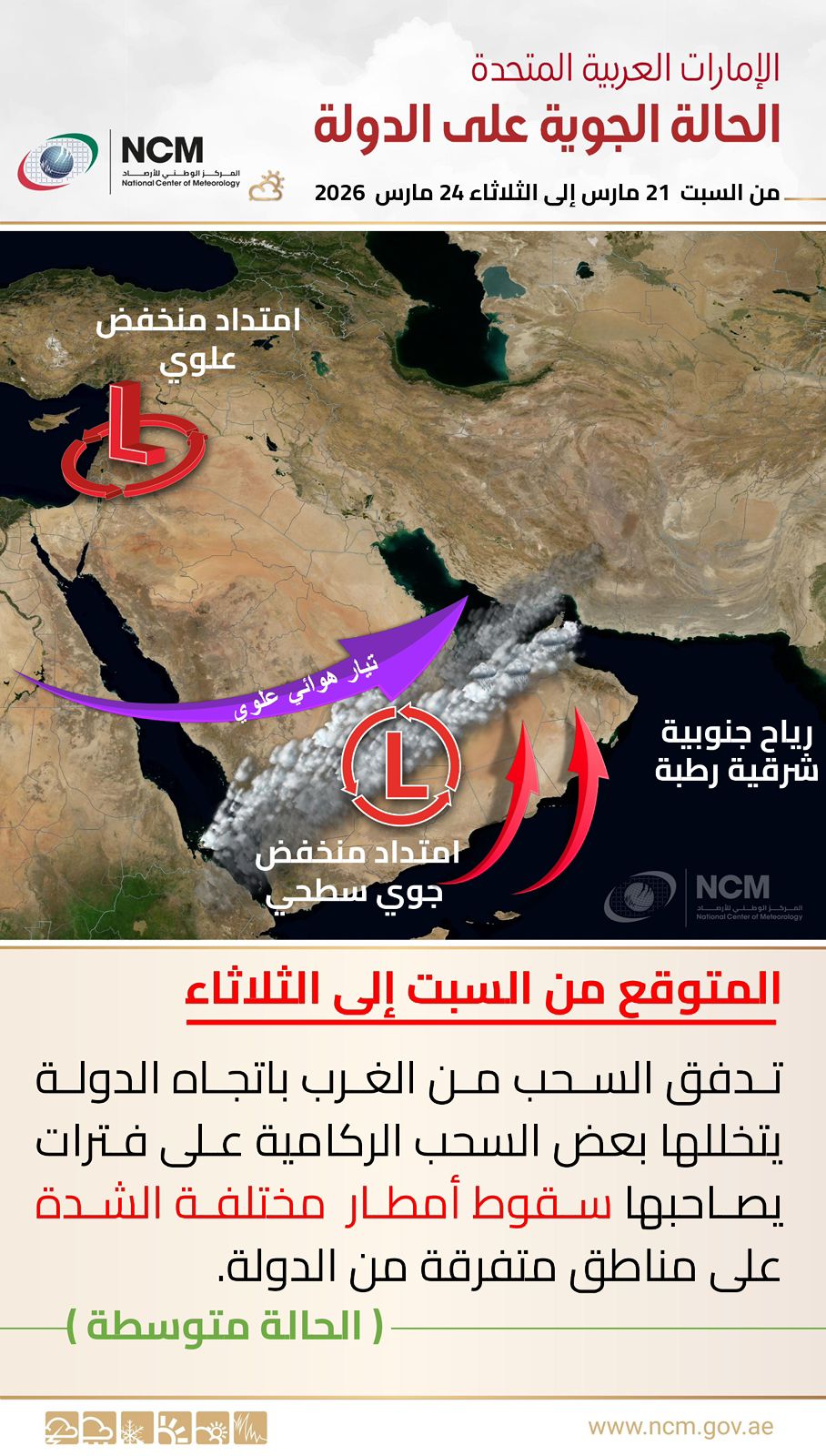 ABU DHABI, 17th March, 2026 (WAM) — The UAE is expected to see clouds moving in from the west from 21st to 24th March, with intermittent cumulonimbus cloud formation, the National Centre of Meteorology (NCM) said.