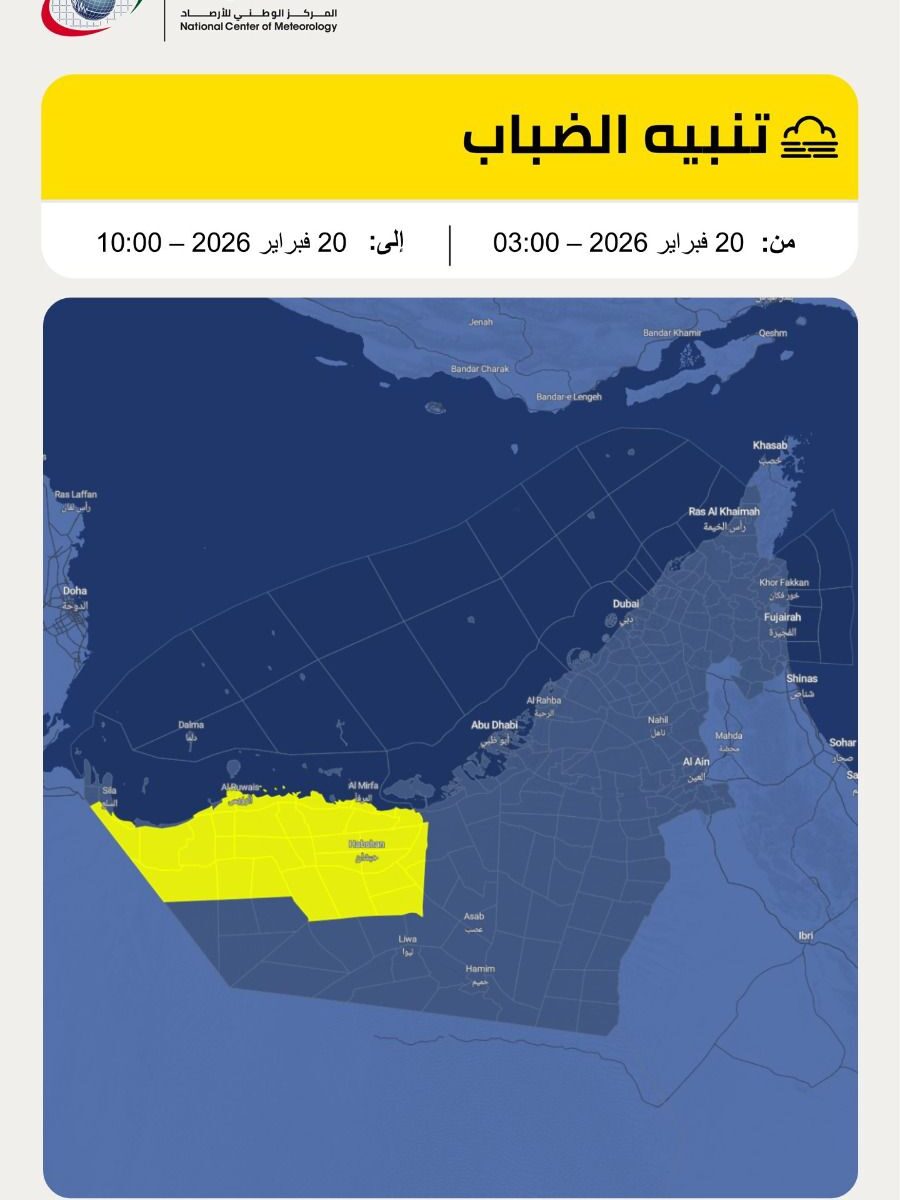 ABU DHABI, 20th February, 2026 (WAM) — The National Centre of Meteorology (NCM) forescast a chance of fog formation with a deterioration in horizontal visibility.