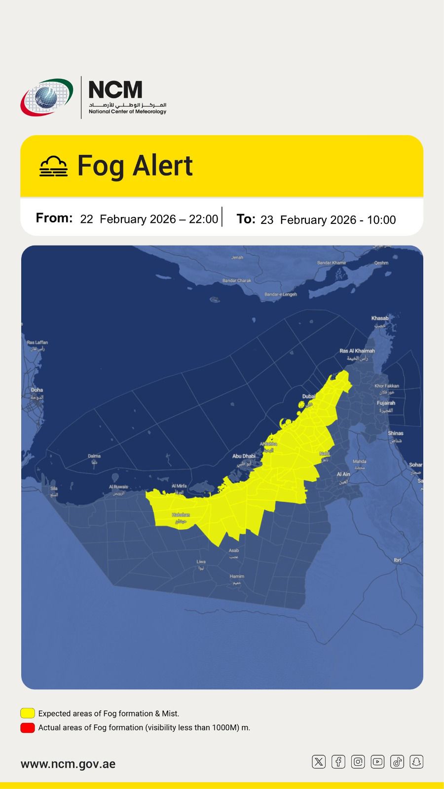 ABU DHABI, 22nd February, 2026 (WAM) — The National Centre of Meteorology (NCM) forescast