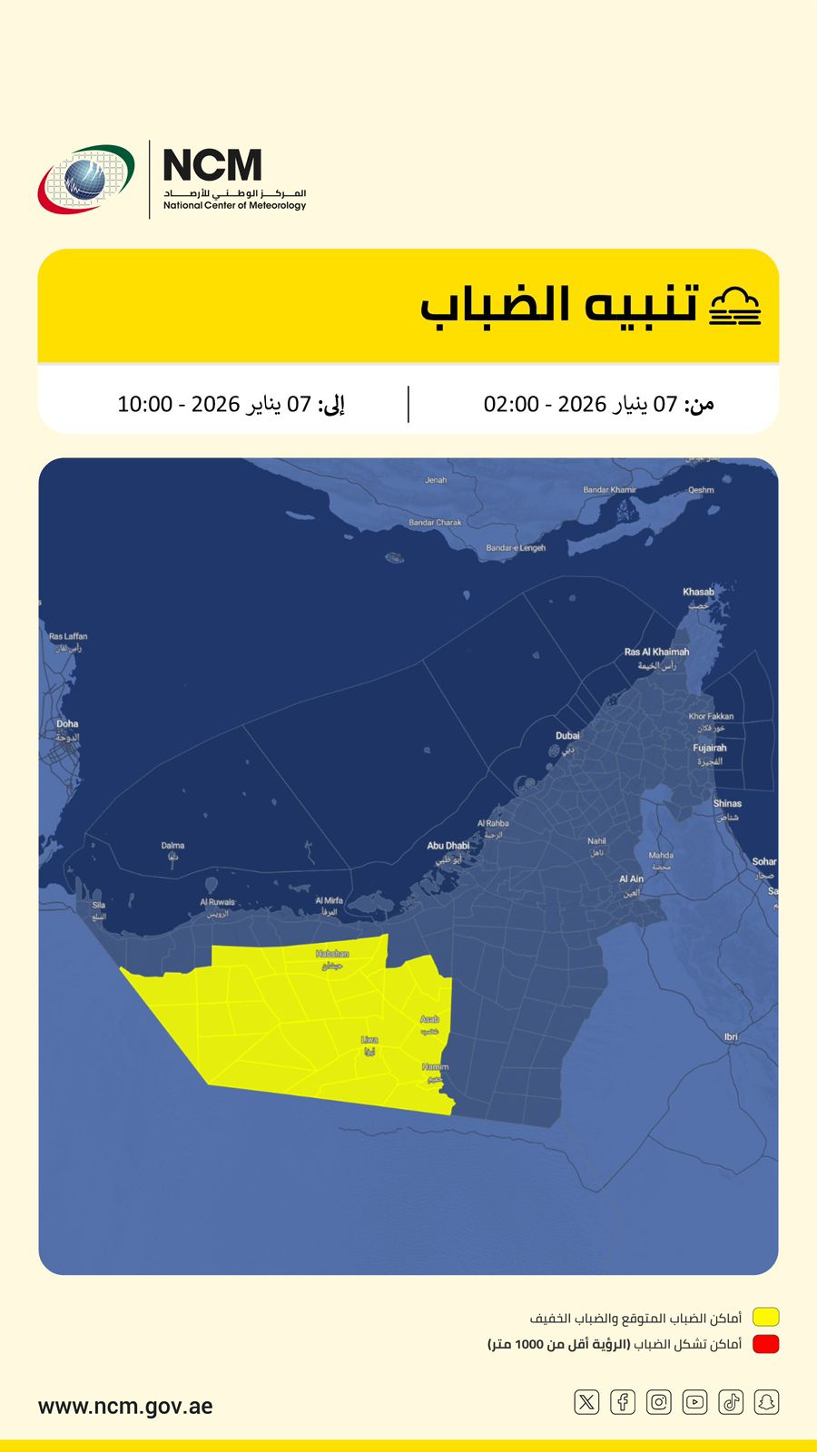 In its statement, NCM said that horizontal visibility is expected to deteriorate, adding that it may drop even further at times from 02:00 until 10:00 Wednesday, 7th January 2026.
