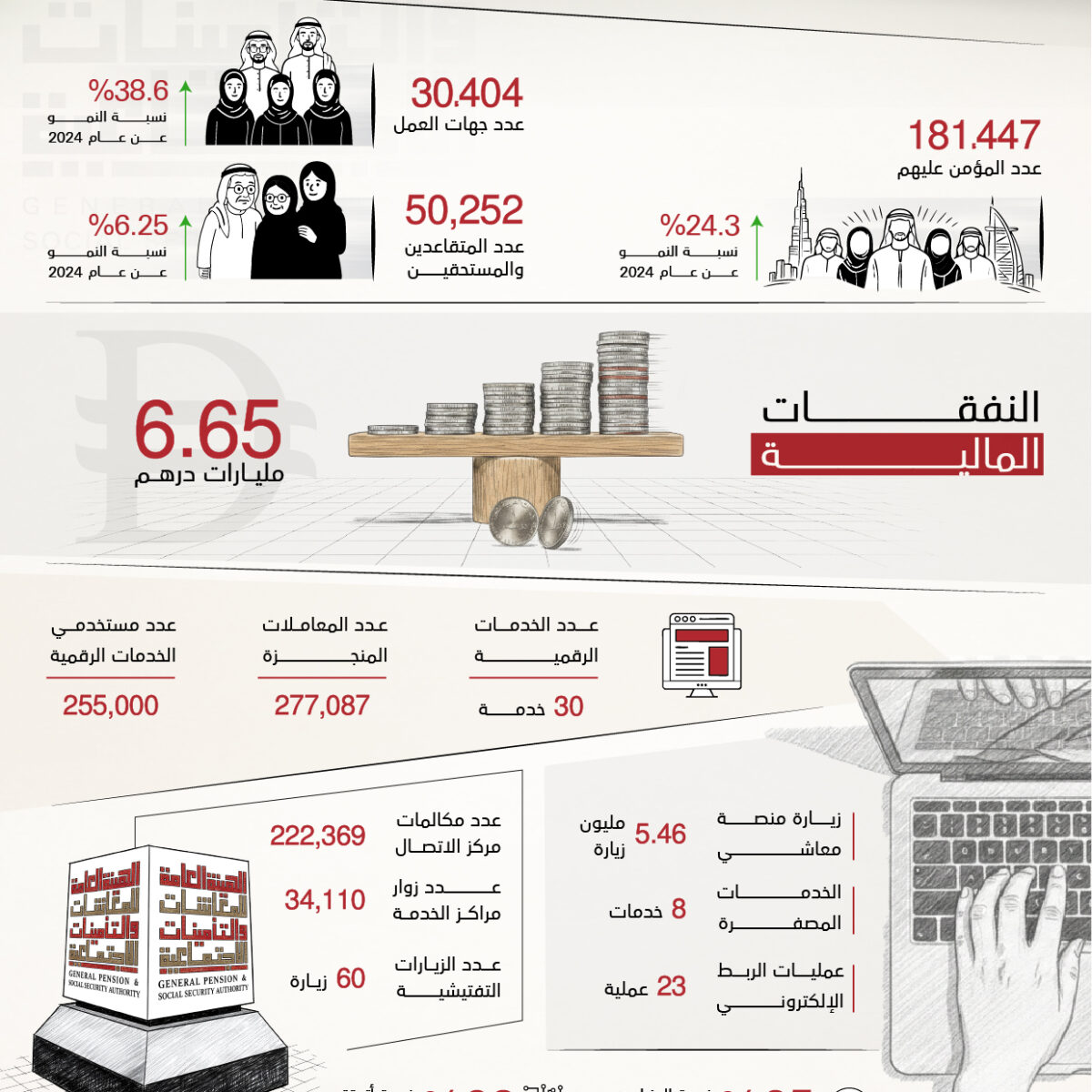 The Ma’ashi digital platform, launched in October 2024, offered 30 services and processed 277,087 transactions in 2025, with a 95 percent on-time completion rate. Digital users rose to 255,000, while visits to the platform reached 5.46 million by December 2025.