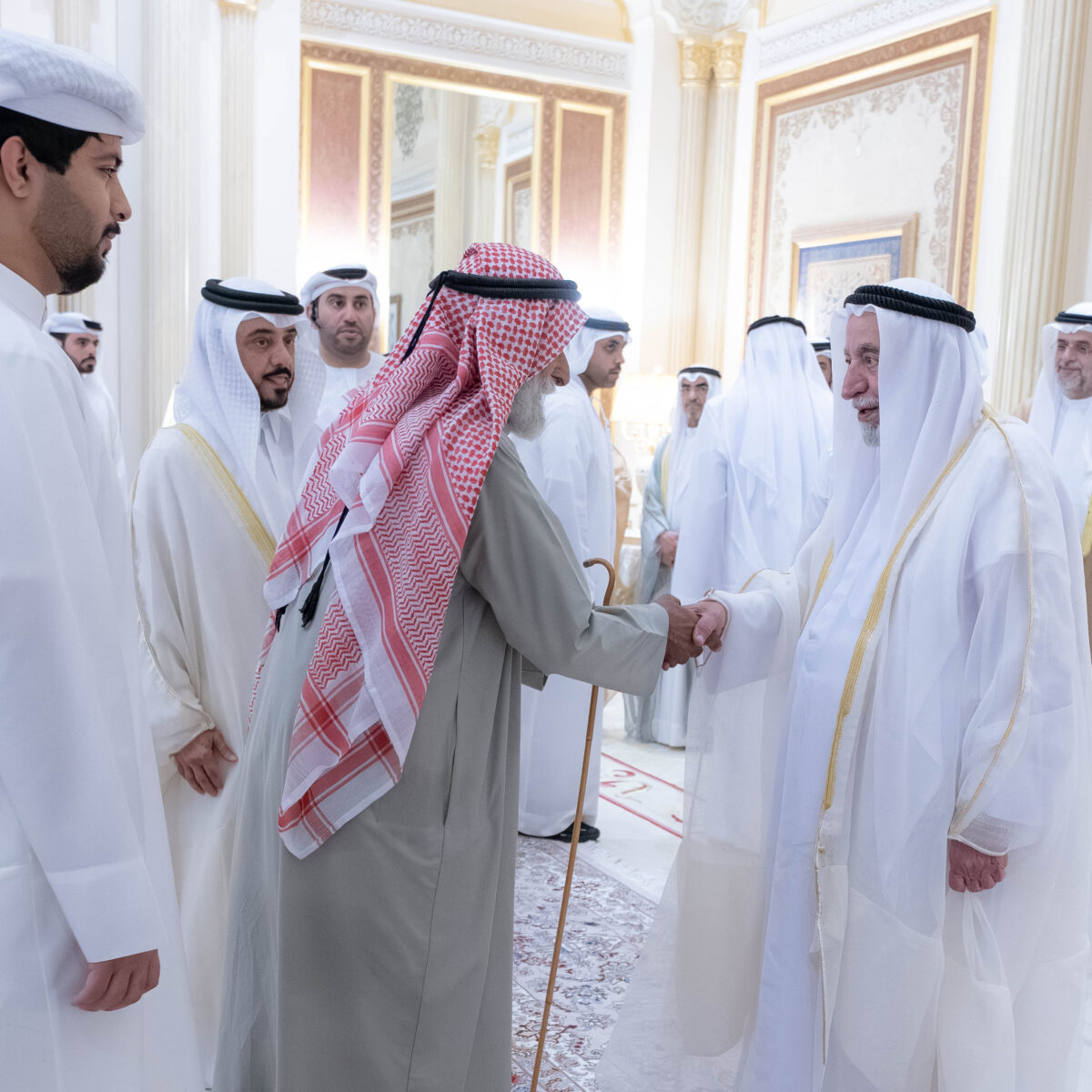 The Ruler of Sharjah accepted congratulations on this blessed religious occasion from sheikhs, Dr Thani bin Ahmed Al Zeyoudi, Minister of Foreign Trade; Abdullah bin Muhair Al Ketbi, Minister of Federal Supreme Council Affairs; senior officials, citizens, members of tribes, and dignitaries.