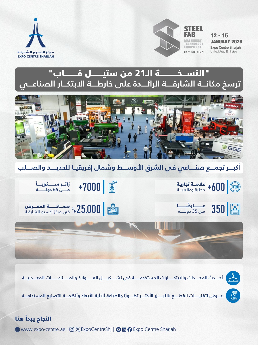 SHARJAH, 11th January, 2026 (WAM) — The 21st edition of SteelFab, the Middle East and North Africa’s largest exhibition for the metalworking and steel fabrication industries, opened on Monday at Expo Centre Sharjah and will run until 15th January.