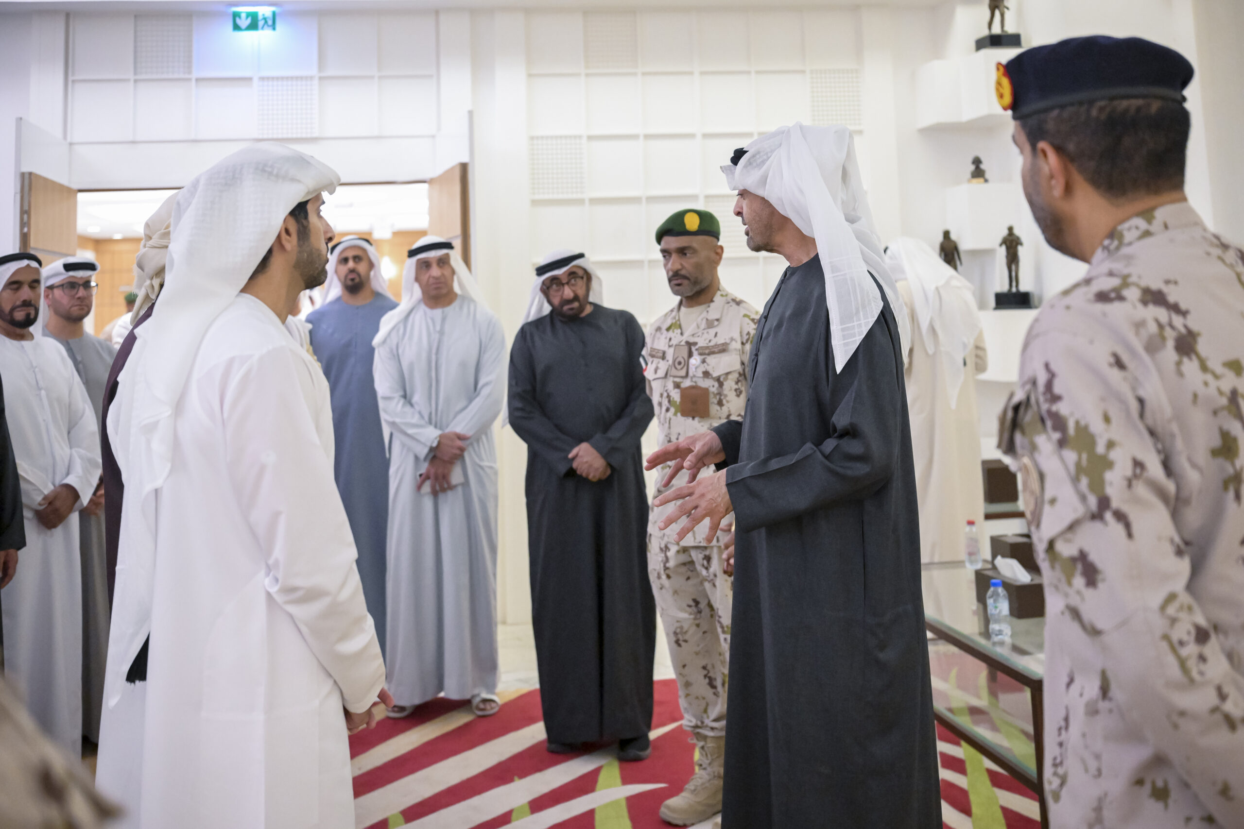His Highness was accompanied during the visit by H.H. Sheikh Hamdan bin Mohammed bin Rashid Al Maktoum, Crown Prince of Dubai, Deputy Prime Minister, Minister of Defence; H.H. Sheikh Hazza bin Zayed Al Nahyan, Ruler’s Representative in Al Ain Region; H.H. Sheikh Theyab bin Mohamed bin Zayed Al Nahyan, Deputy Chairman of the Presidential Court for Development and Fallen Heroes’ Affairs; Mohamed Mubarak Fadhel Al Mazrouei, Minister of State for Defence Affairs; Lieutenant General Ibrahim Nasser Al Alawi, Under-Secretary of the Ministry of Defence; Hamad Mohammed Thani Al Rumaithi, Military Affairs Adviser to the UAE President; Khaldoon Khalifa Al Mubarak, Chairman of the Executive Affairs Authority; Faisal Abdulaziz Mohammed Al Bannai, Adviser to the UAE President for Strategic Research and Advanced Technology Affairs; and a number of senior officers of the Ministry of Defence..